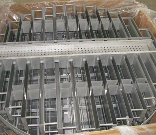 實(shí)現(xiàn)傾斜板對全截面的覆蓋,能夠?qū)σ后w收集時(shí)提升收集效率,這是柵板式支承-收集-再分布器的最Z大優(yōu)點(diǎn),但是對于上升氣流的干擾以及高度的增加,會(huì)導(dǎo)致其性能受到一定程度的影響。因此,應(yīng)該采用合理的方式對柵板式支承-收集-再分布器進(jìn)行改進(jìn)。柵板支承絲網(wǎng)填料的過程中,液體受到上升氣流的影響,會(huì)通過塔壁四周流下。這是由于在網(wǎng)片中存在一定程度的毛細(xì)作用,加上上升氣流的上舉力作用,導(dǎo)致液體下落有在困難。為了有效對液體進(jìn)行收集,需要采取合理的導(dǎo)流措施。為了便于液體分散落入分布槽中,可以將柵板下緣設(shè)計(jì)為鋸齒狀。液體沿內(nèi)壁流下后通過集液環(huán)由環(huán)形槽收集。多孔型和溢流型柵板式支承-收集-再分布器的設(shè)計(jì),能夠分別在小流量和大流量操作中提升工作效率。